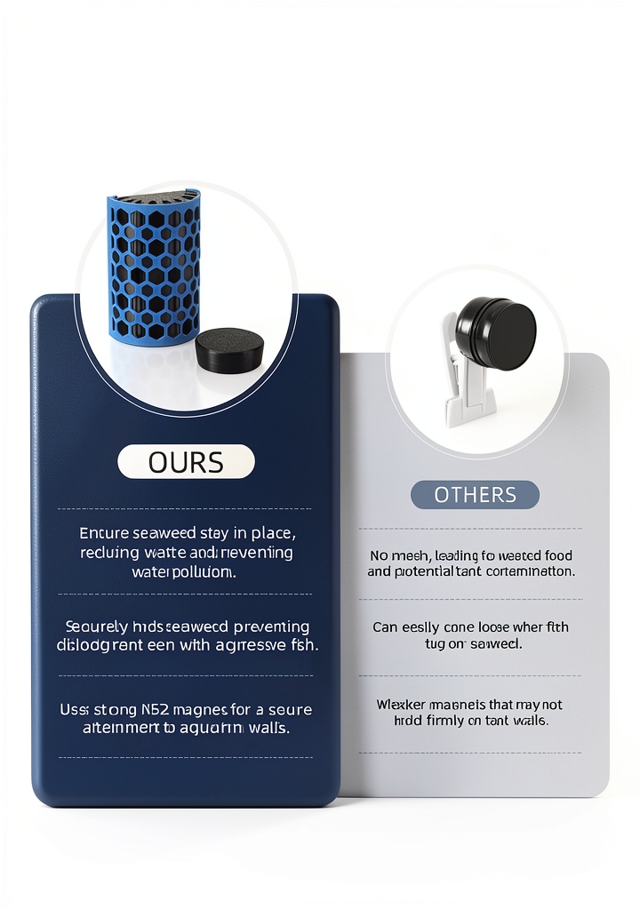 Our automatic fish feeder stands out due to its focus on quality and innovation. The rust-free sealed design ensures long-term use without corrosion, a common issue in aquatic products. By minimizing food waste through secure seaweed retention, it helps preserve water quality and supports a healthier ecosystem. The use of high-grade N52 magnets provides superior adhesion, reducing the risk of detachment. Additionally, the efficient feeding design encourages natural behaviors, offering a practical and reliable solution for aquarium maintenance.